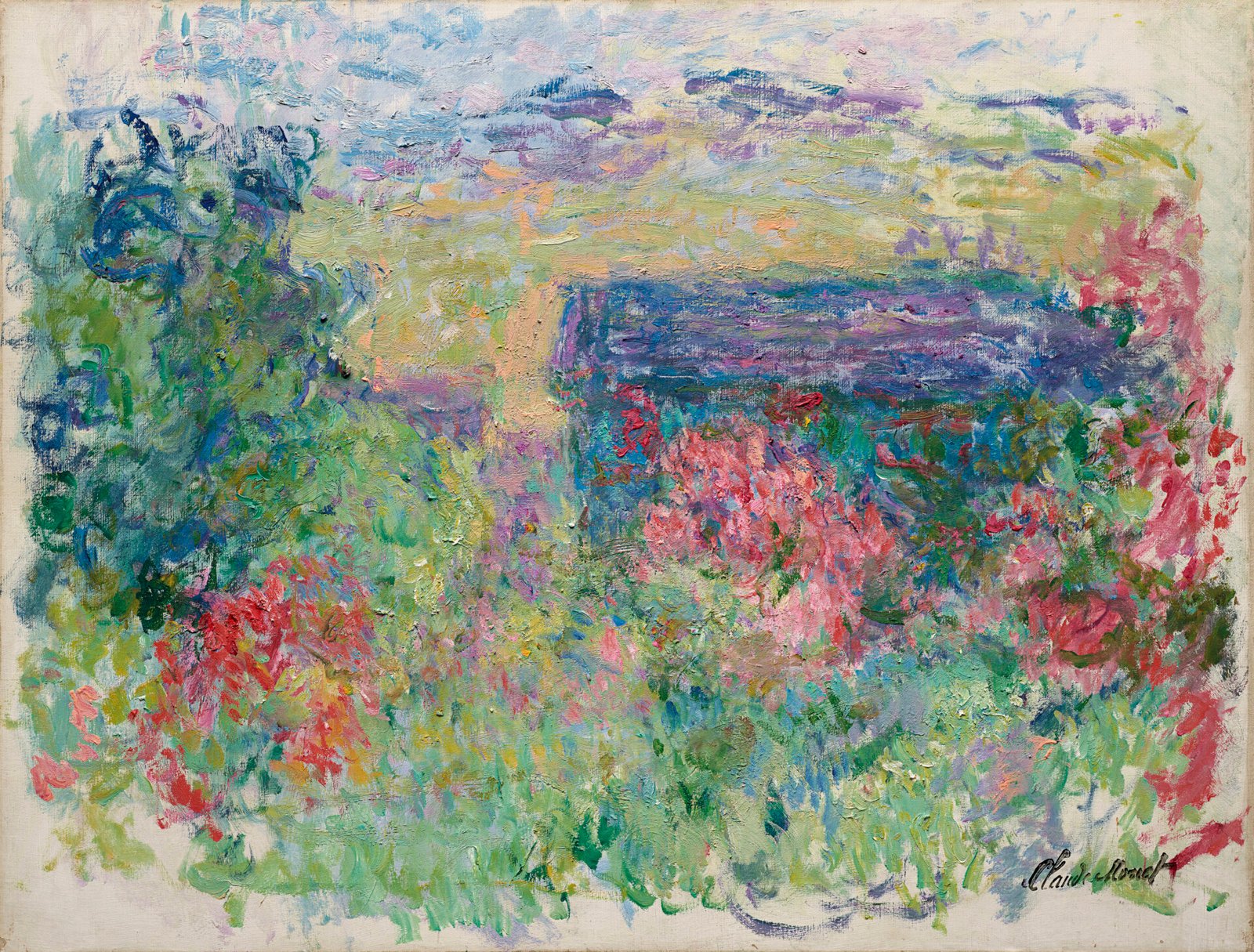 以斑斕色彩為筆墨、以光影節奏重塑視覺邊界,莫奈晚期的先鋒鉅作〈玫瑰叢中的房子〉展現其引領抽象表現主義潮流的開創性視野。今年適逢莫奈逝世100週年,全球藝壇自紐約至東京紛紛舉辦紀念展,引領新一輪對莫奈的火熱關注。本作屬其1922–1926年描繪其屋邸的系列之一——一共僅18幅,7幅現藏於國際重要美術館。此時期的莫奈專注描繪吉維尼自宅與花園,與〈睡蓮〉、〈日本橋〉並行構築出極具私人情感的創作世界。本作延續橘園美術館〈大裝飾畫〉的沉浸式視野,以色彩與光的交錯取代傳統空間結構,預示了20世紀中期抽象繪畫的語言,對後來的抽象表現主義與色域畫派皆產生深遠影響。