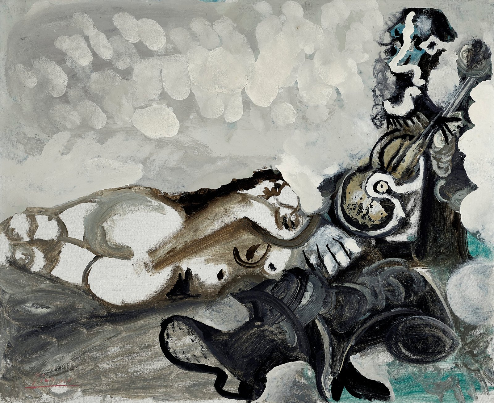 〈側臥裸女與音樂家〉為巴布羅·畢加索最經典的題材「藝術家與模特」的變奏,畫中畫家形象時而轉化為音樂家,使工作室場景化為更親密、帶有浪漫氣息的相遇。作品同時體現畢加索向古典大師致敬的獨特方式,他自1950年代中期起便頻繁重訪藝術史名作,藉此思索自身在藝術傳統中的位置。本作尤其呼應提香的〈維納斯與音樂家〉系列:音樂家以華麗巴洛克風格呈現,裸女則透過立體主義語彙重構形體。作為媒材革新的先鋒,畢加索亦率先使用快乾工業琺瑯漆Ripolin,藉其光滑、無筆觸的質地及自然皺裂、滴流的效果,創造出獨特視覺張力。畫面保留了強烈的創作痕跡,筆觸果斷有力,虛實與厚重堆砌之間形成富節奏感的視覺對比。本作曾於1977年舉行的【畢加索】展中展出——這亦是自1936年以來藝術家在馬德里的首場個展,展覽由胡安.馬奇基金會主辦;其後並巡展至巴塞隆拿畢加索美術館。