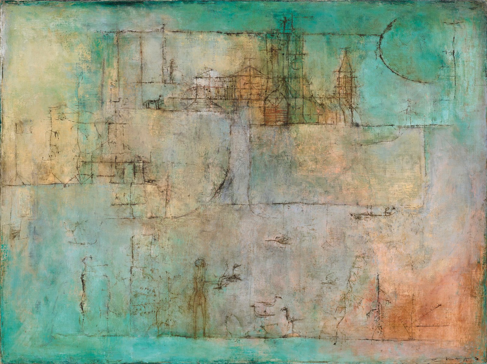 接著跟隨趙無極踏上絢爛旅途,佳士得迎來藝術家於1950年代初創作的罕見大尺幅重要之作〈聖堂之旅 – 07.08.51-08.09.51〉。根據《趙無極:油畫全集第一集》記載,他在1950至1953年間僅創作225件作品,而其中僅有13件尺幅與本作相同或更大——兩件更為巴黎龐畢度中心永久館藏。作品源自藝術家進行「壯遊」的時期,他以現代視角重述歐洲年輕藝術家吸收文化與建築遺產的傳統,在跨越邊界、光線與風景的旅途中逐漸遠離具象風景畫,走向更自由、象徵性的抒情抽象。畫面亦呈現東西方視覺經驗的自然交匯:上方延伸的建築線條暗示遠方的宗教建築意象,下方則以簡練線條捕捉中國傳統的訓鳥與漁作場景。這些旅途中疊加的視覺記憶被趙無極以獨特方式編織於同一畫面之中,成就其早期風格突破的重要里程碑。