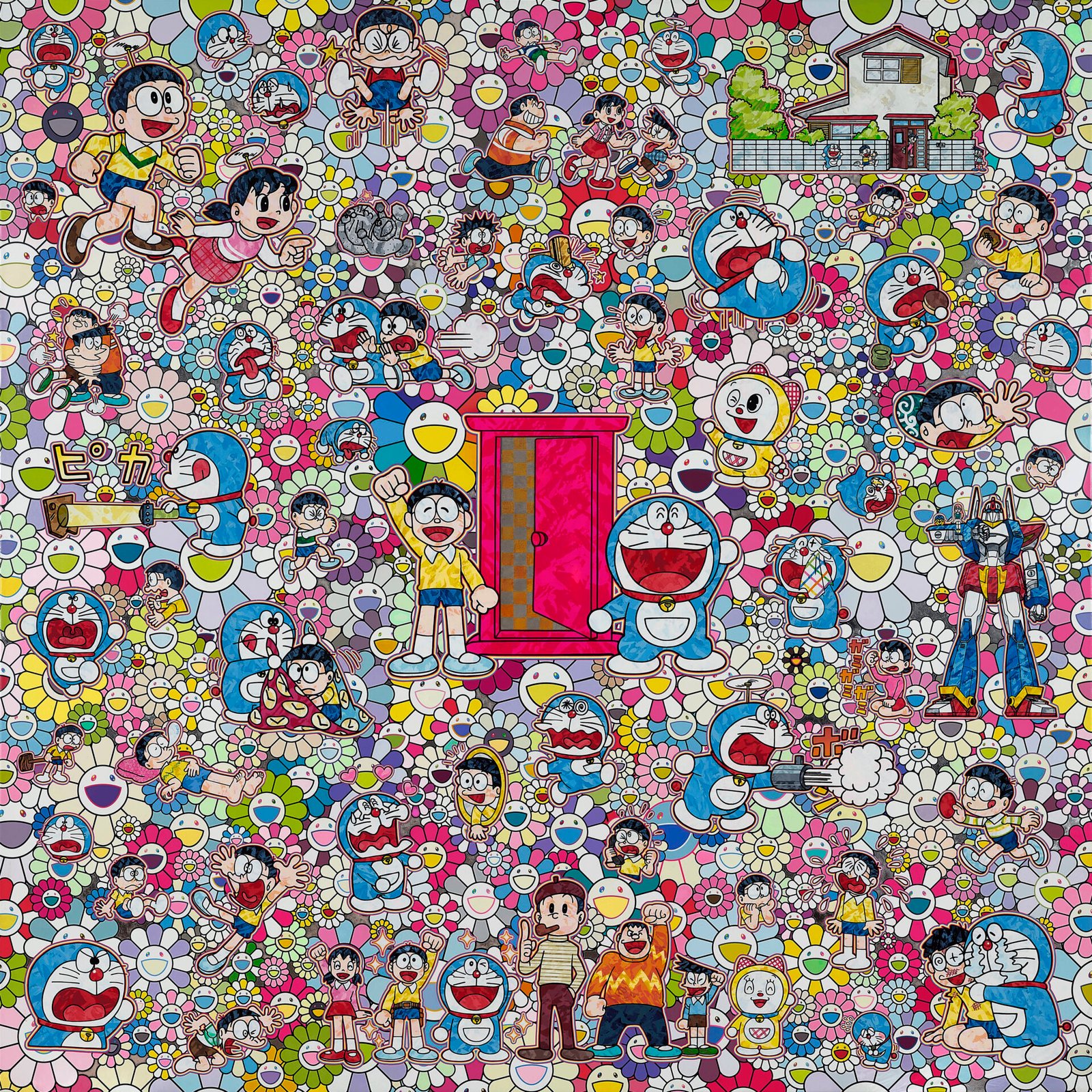 〈穿過隨意門,開心冒險的一天!〉為首次登上拍場,將標誌性的太陽花與多啦A夢的多重場景交織。自2002年起,多啦A夢便在村上隆的創作中不斷延伸,源於他受邀參與藤子.F.不二雄策劃的【請各位畫家創作自己的多啦A夢】展覽,自此這位經典角色成為其藝術宇宙中的重要母題,呼應他提出的「超扁平」理念,亦折射御宅文化及動漫養分在其早期藝術養成中的深刻影響。本作以類似日本傳統「繪卷物」的長卷鋪陳方式,使畫面穿越不同時空自由流動;同時可見江戶時代繪畫的影響,如市松紋及金箔質感的視覺處理皆向其致意。細看畫面,無數「多啦A夢」經典場景巧妙隱於其中,甚至可在下方中央看見象徵藤子.F.不二雄的身影,令人倍感親切與共鳴。