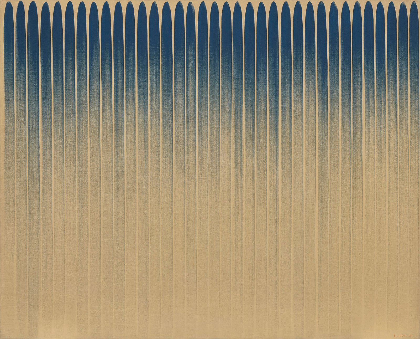 〈始於線 No. 780352〉創於李禹煥1970年代的巔峰時期,此系列於1973年在東京畫廊首次亮相,靈感源自藝術家在 1971 年巴黎雙年展後首次赴西方的旅程,以及於紐約長達三個月的密集觀察與吸收。1974年更為關鍵:紐約現代藝術博物館(MoMA)收藏的該系列唯一一幅作品即創作於同年。本作正體現李禹煥以「線」探索時間與空間的哲學旨趣,他曾言:「線必有始有終;空間在時間的流逝中生成,而當空間的生成停止,時間亦隨之消逝。」作品以透明的黃色油彩薄塗打底,使深藍線條產生細微震動般的視覺效果;線條使用以礦物群青粉末混合動物膠製成的傳統(日式日本畫 Nihonga)材料,上方呈現啞光質感,保留自然礦物的深度。