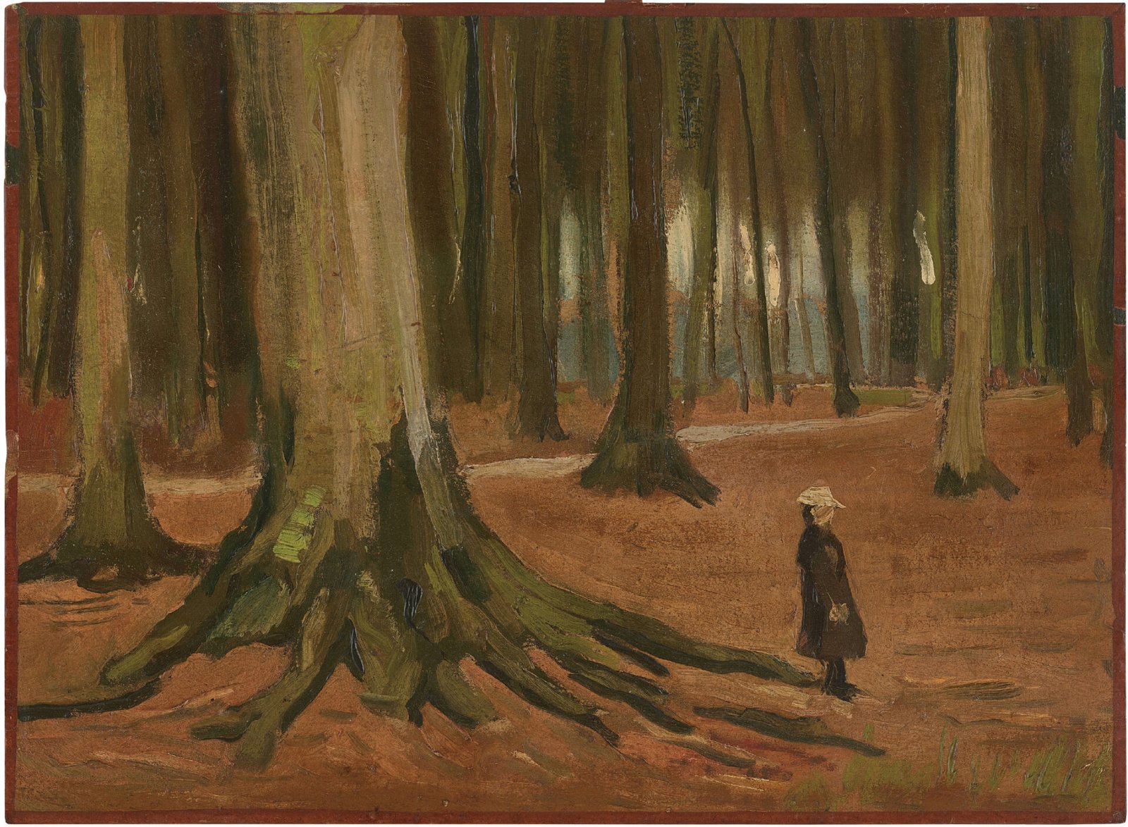 〈林中少女〉為文森特·梵高早期存世的油畫之一。作品誕生於極具關鍵性的海牙時期——當時海牙是荷蘭重要的文化與思想中心,海牙時期的油畫存世極為稀少:在信件中提及的70多件作品中,今日僅知約24件油畫,其10件更已入藏公共機構。本作極可能為戶外寫生之作,與梵高在寫給弟弟提奧的信中所描述的經驗相符,並深受巴比松畫派,特別是尚·佛朗索瓦·米勒的影響,展現他自此始終堅持的自然寫生方式。畫面採用獨特的俯視視角,以人物為焦點,在巨大的樹根與小女孩的對比中形成戲劇張力,前景厚重雕塑感的筆觸與遠景輕快通透的線條相互映襯,創造深邃的空間層次。