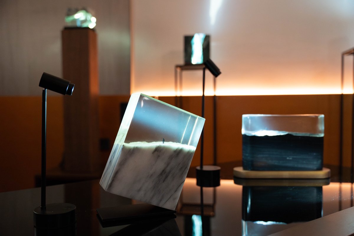 「媒體藝術(Media Art)」展區以多媒材創作自由呈現當代敘事的開放性與實驗性。飛皇畫廊以「趨光而行」為策展主題,透過光影、物件與身體經驗建構論述。李曜丞以裝置〈趨光〉凝結光的瞬間,將大理石化為介於劇場與心緒之間的感知場域;藝術家小山俊孝(Koyama Toshitaka)透過「痕跡」影像,從皮革、牆面等老化物件中提取被消費時代稀釋的人性記憶;旅英錄像藝術家杜宜蓁則以影像探問身體政治與科技邊界,揭示人類與非人類、有機與人工之間的模糊張力,帶領觀者在流動的空間體驗中捕捉藝術的細膩能量。