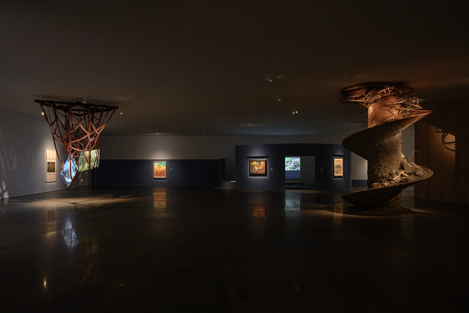 臺灣策展人周伶芝所提出的內容又與前面兩位國際策展人不同。周伶芝對於原民藝術的研究,就能從身體作為串連,讓展覽脫離制化靜態的表述、進而有動態的演出來豐富視覺層次」。基於此所延伸出的五個子題:「畫一道海岸線」是以多元媒材描繪自然,「幻生的寓言」談的是解構人/非人關係,「摺疊的風景」以哲學概念討論時空、身分的非線性結構,「擾動的記憶」檢視自然史與個人、集體經驗的交錯,「萬物初聲」落腳於面向未來的共存和修復可能。最值得一書的是,因為這是臺灣公設館所當中,首度採圖書館與美術館共構的規格出現,因此中美館開館展亦有相當篇幅是凌駕視覺藝術範疇,充分落實在文學/視覺兩個閱讀感。